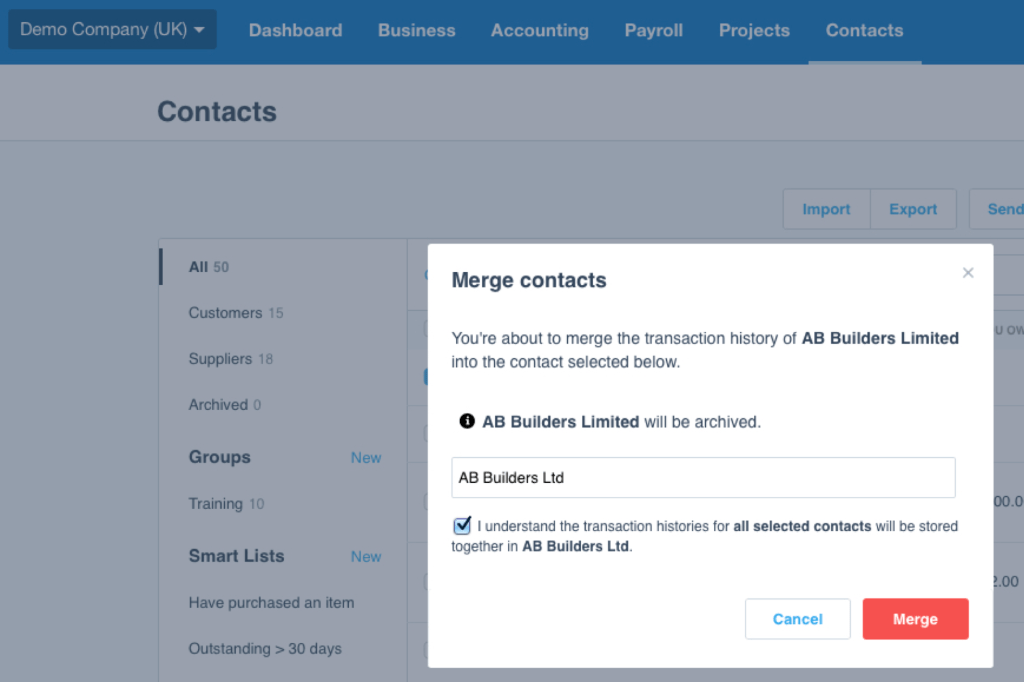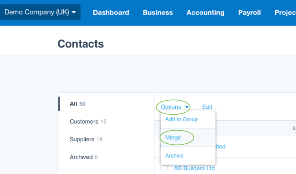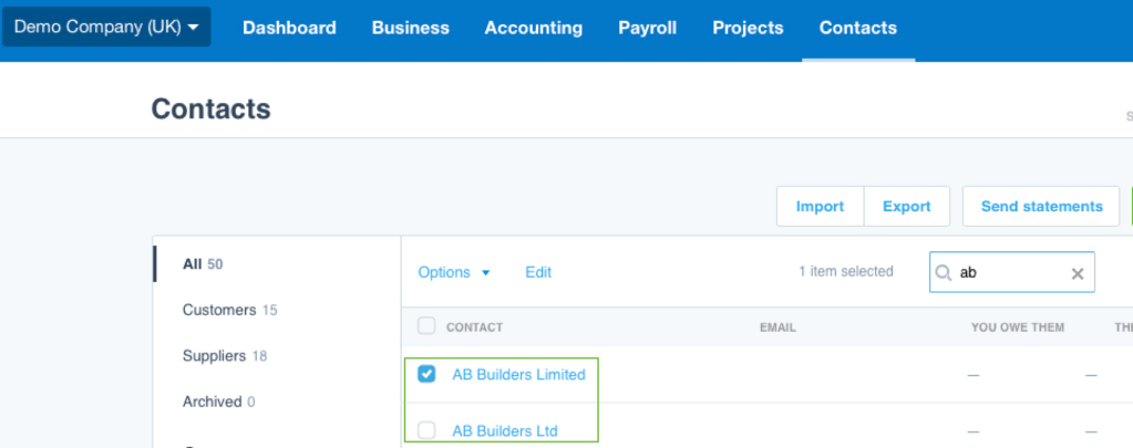 Occasionally Xero will duplicate a Contact because there’s a slight variation in the name. For example, say you have an existing Contact for a company called AB Builders Ltd., but a manual entry or AutoEntry/Receipt Bank submission for AB Builders Limited is made in Xero and a new Contact is created for the same customer or supplier.